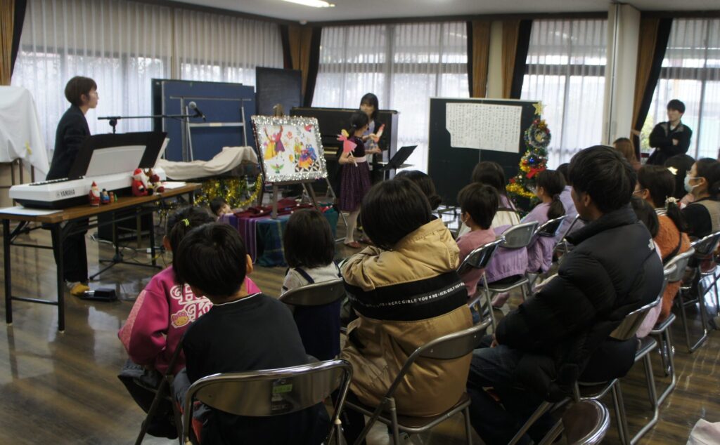 12月のにこにこ食堂みのりは「米と茶碗(こめとちゃわん)」さんをお招きして、Ⅹ‘masいさな音楽会が開催しました。「音楽紙芝居」もあり、会場のみんな一緒にクリスマスソングを歌い、にぎやかで楽しい音楽会となりました。恒例の0ゼロ円マーケットもオープンし、衣料品、雑貨や書籍のほか、ゴボウ、ニラまで0円でお持ち帰りいただきました。