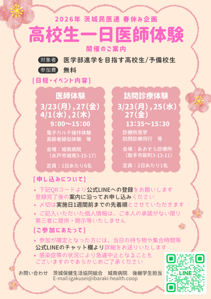 茨城保健生活協同組合では高校生・受験生を対象とし、春休み期間に一日医師体験を開催予定となっています。